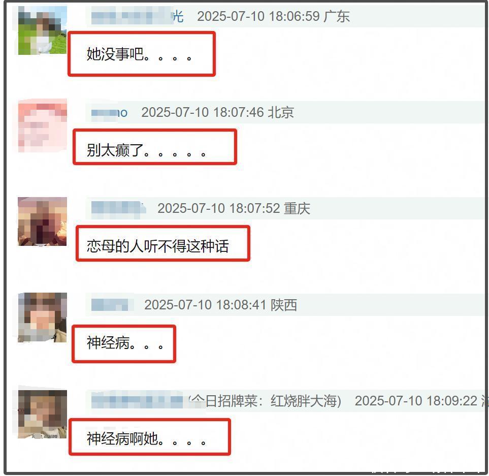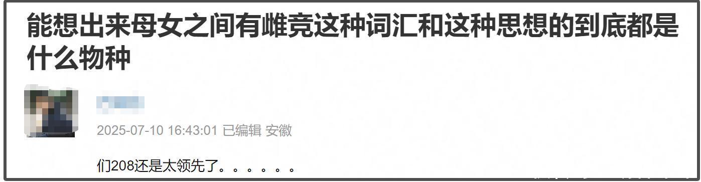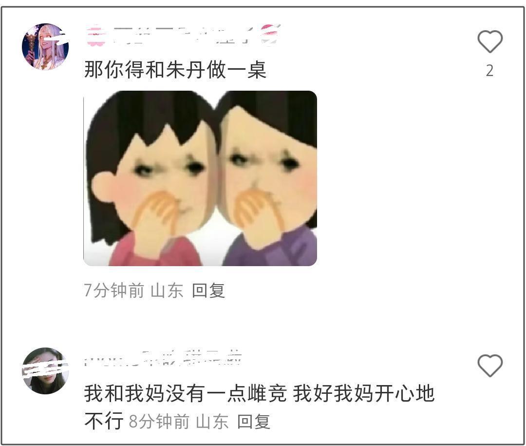 不少网友看到马伊琍表示与女儿之间有雌竞直接炸了,纷纷在评论区表态自家不一样,女儿与妈妈都是平等有爱,真心盼着对方好,斥责马伊琍的雌竞是例外,行为太癫狂。还有的网友则表示马伊琍的行为简直就是另外一个朱丹,两人适合同桌玩。